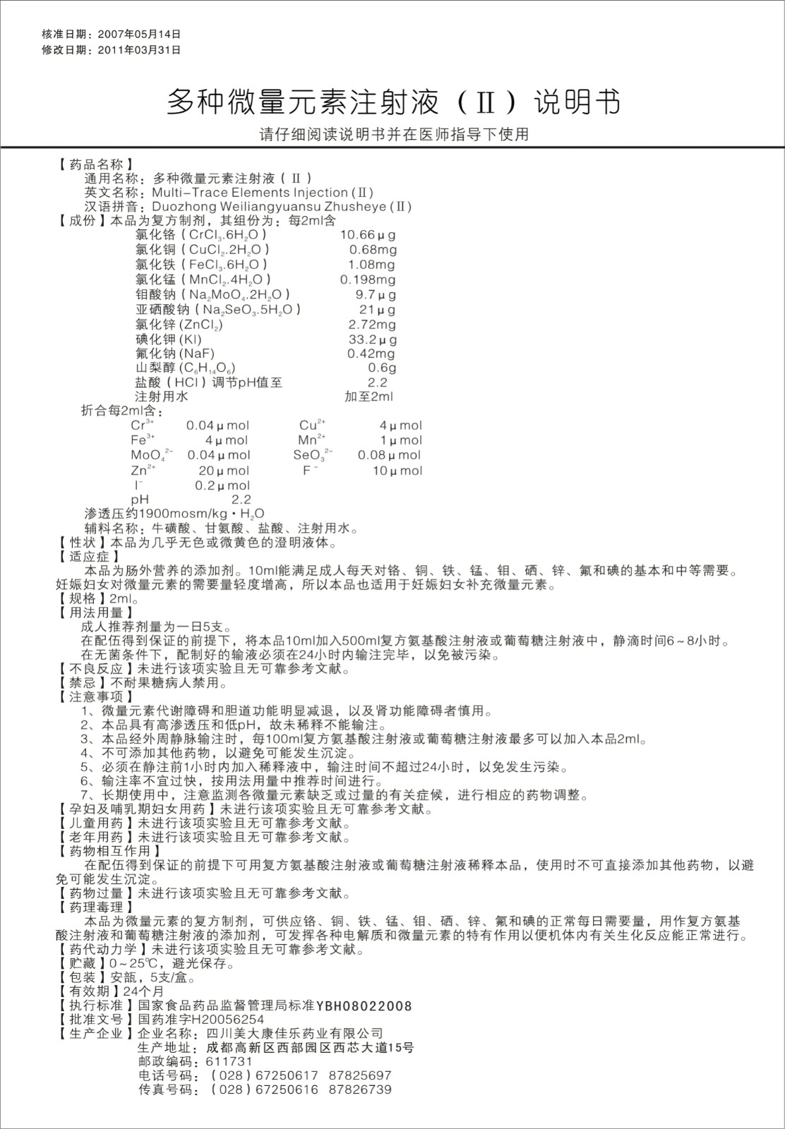 本品為腸外營(yíng)養(yǎng)的添加劑。10ml能滿足成人每天對(duì)鉻、銅、鐵、錳、鉬、硒、鋅、氟和碘的基本和中等需要。妊娠婦女對(duì)微量元素的需要量輕度增高,所以本品也適于妊娠婦女補(bǔ)充微量元素。